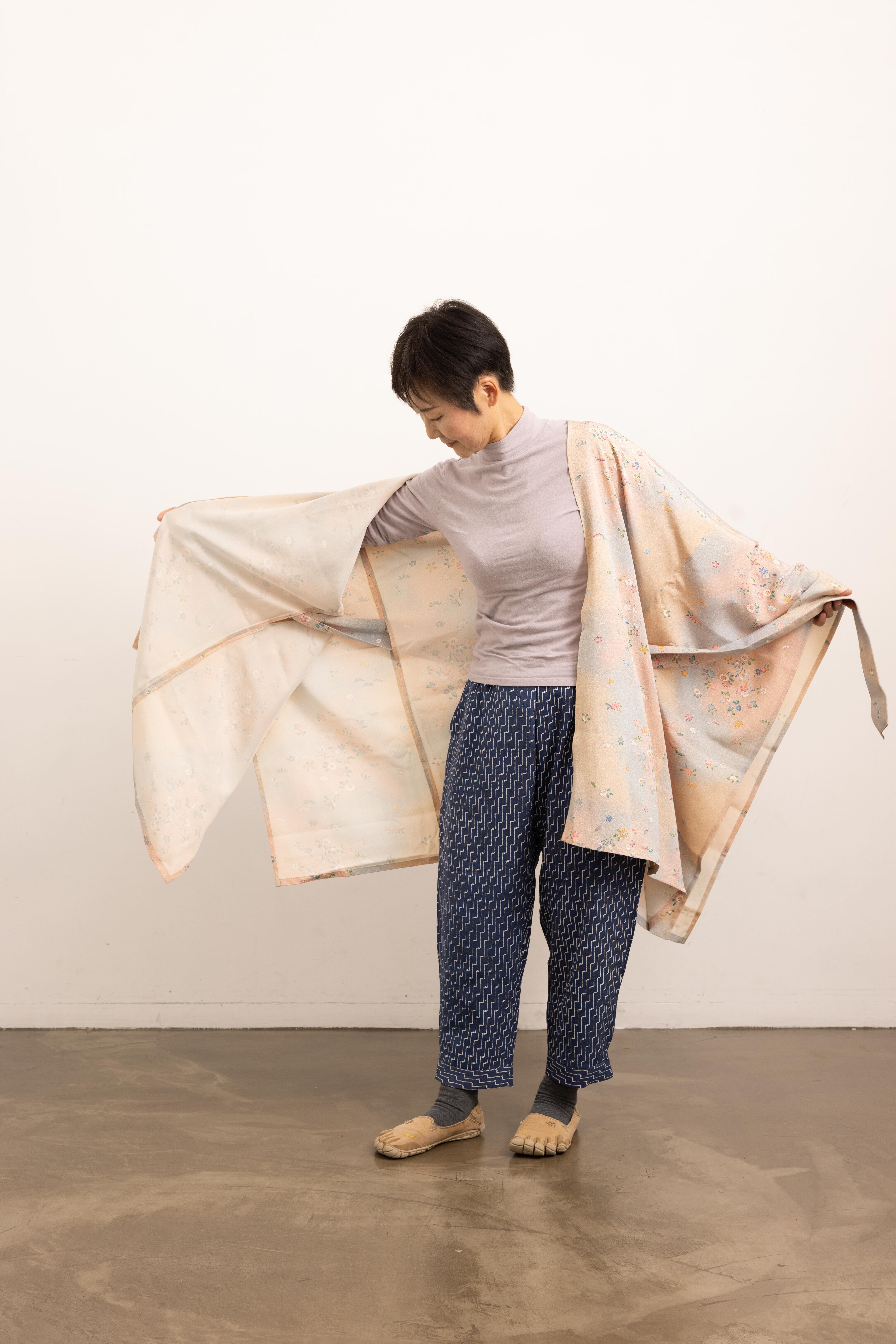 It can be worn as a kimono-like silhouette when it is entirely covered and a belt is attached. When the front part is draped over the shoulders, it looks like a cloak, and when the whole piece is belted together, it can be worn like a dress.