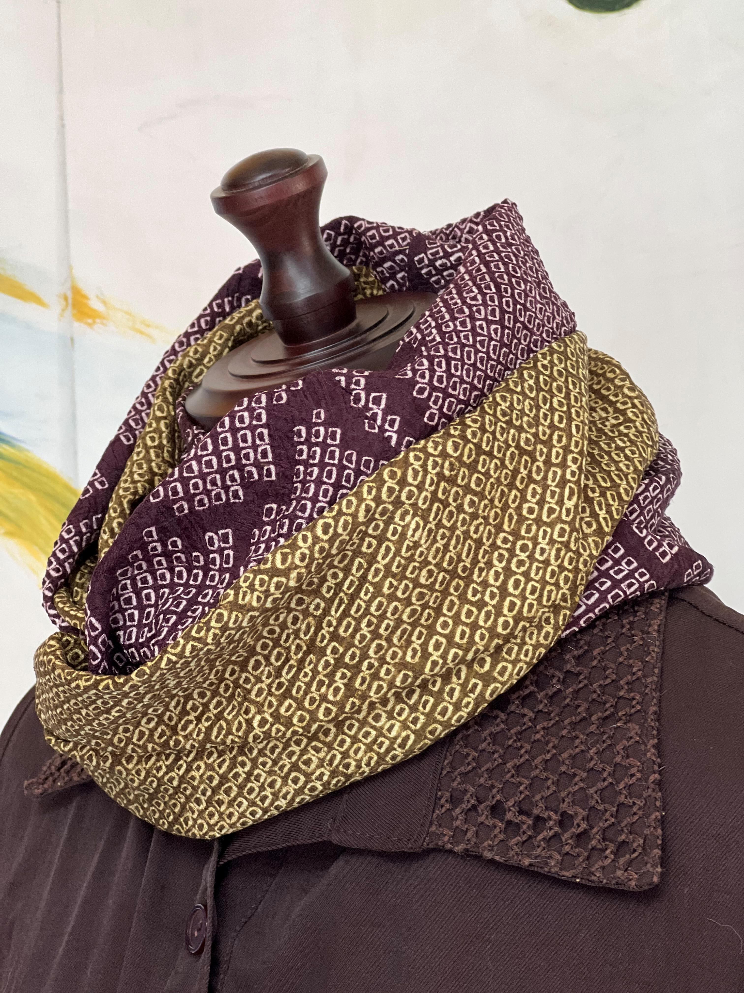 Made from shibori kimono. The soft snood fits tightly around your neck and protects you from wind and cold. The length is just long enough to wrap around the neck in two layers, so it is neat and tidy without being bulky. Silk adjusts the humidity, so it is not too hot and protects your throat even indoors, allowing you to enjoy fashion.