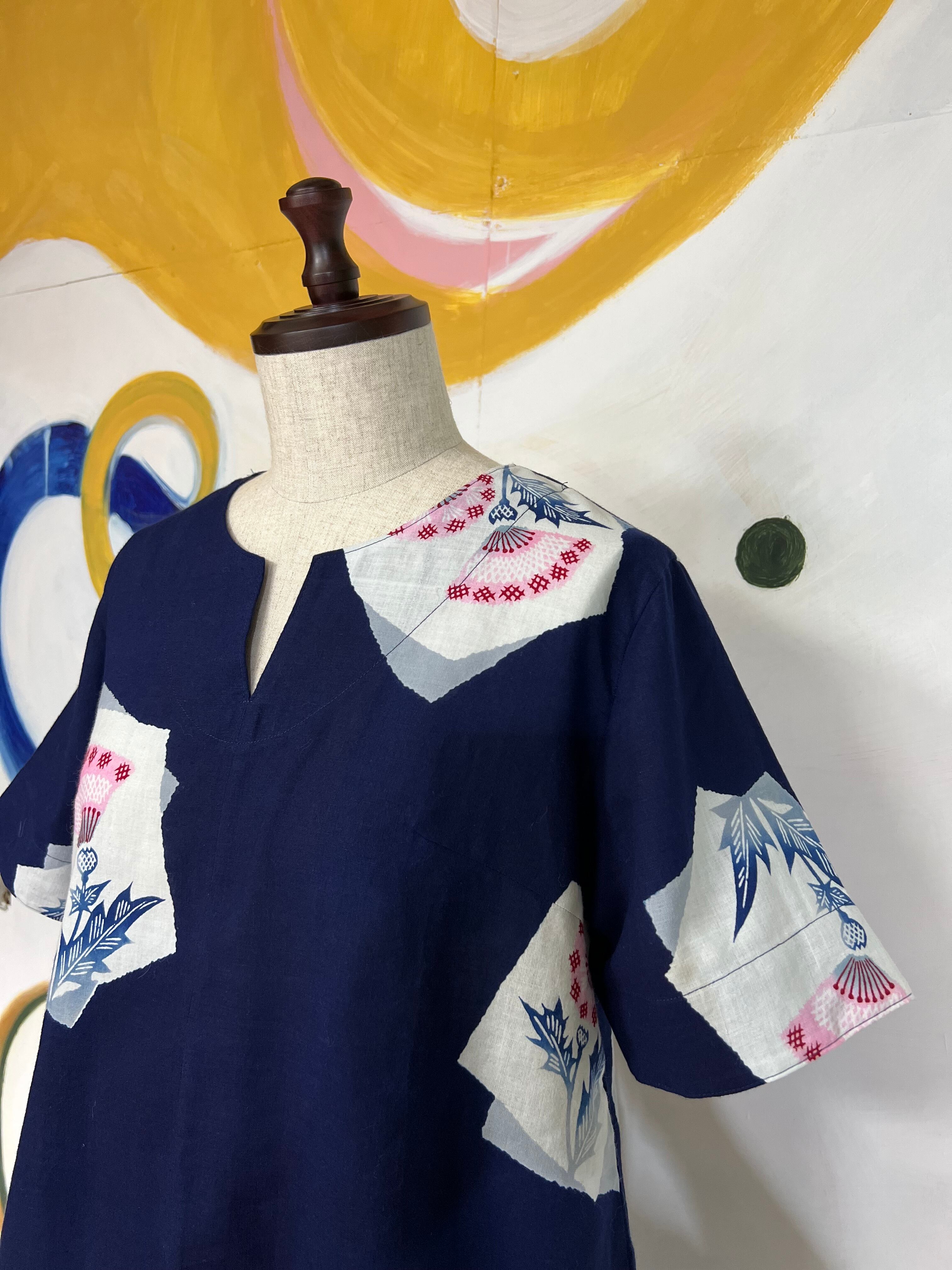 This is an upcycled version of the yukata, a kimono worn in the hot Japanese summer. The pattern is also uniquely Japanese, with a nadeko motif. It is breathable and lightweight even when sweating. The slit in the neckline makes it easy to put on and take off.